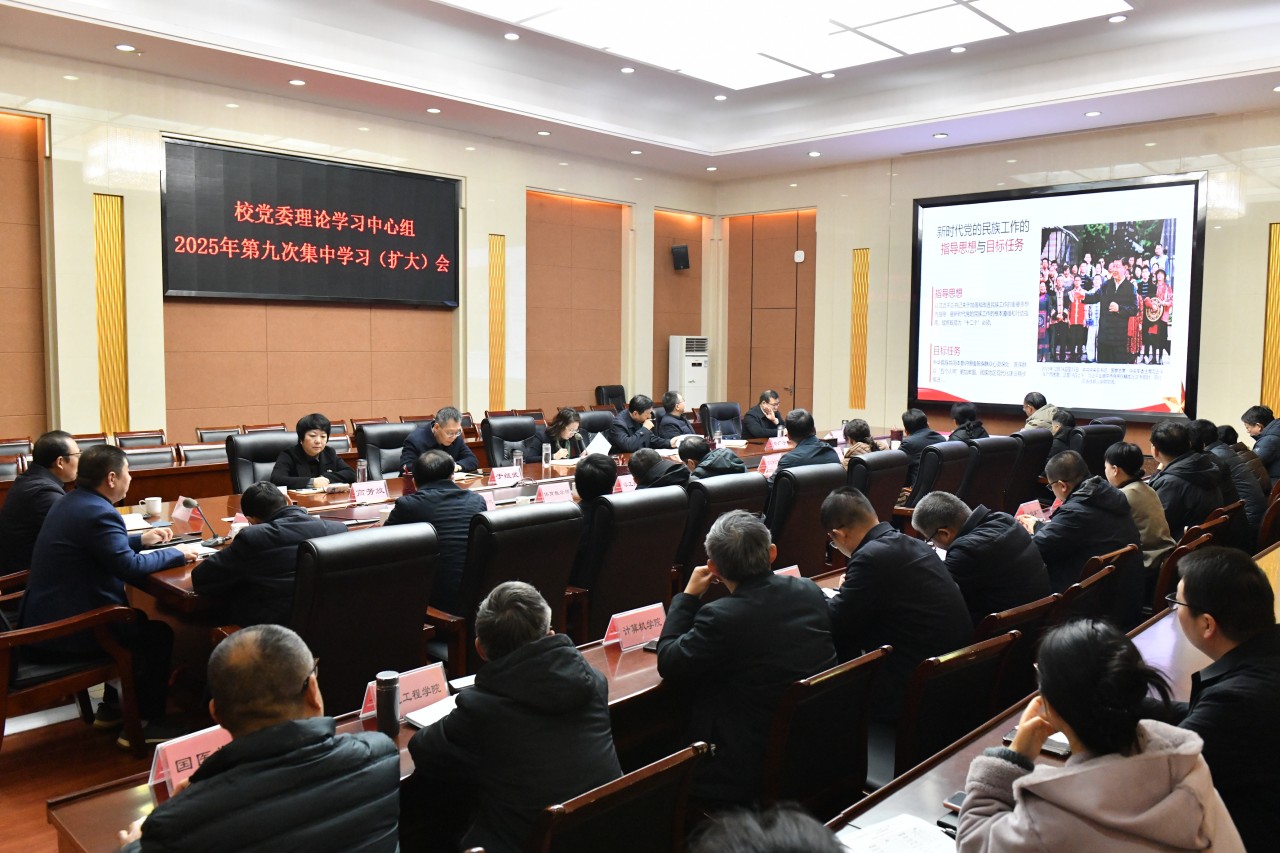 本网讯(记者/王小婉)12月25日上午,校党委书记张爱红主持召开校党委理论学习中心组2025年第九次集中学习(扩大)会,围绕《习近平谈治国理政》(第五卷),习近平总书记关于安全生产的重要论述和重要指示批示精神、关于铸牢中华民族共同体意识的重要论述、关于宗教工作的重要论述进行专题学习。校党委理论学习中心组成员、各直属党组织书记和相关处室负责人参加。