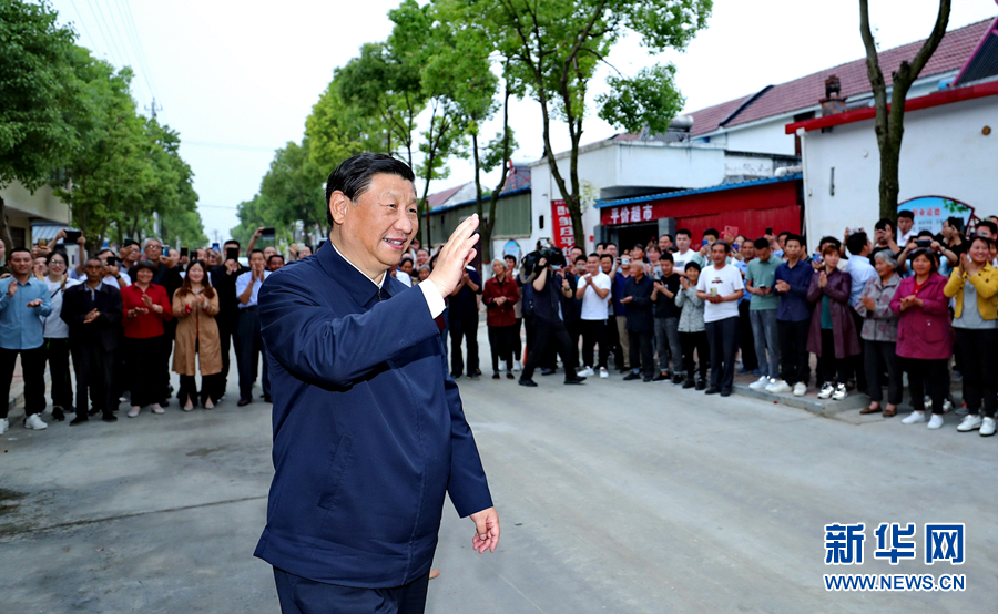5月14日上午,中共中央总书记、国家主席、中央军委主席习近平在河南省南阳市主持召开推进南水北调后续工程高质量发展座谈会并发表重要讲话。这是座谈会前,习近平于13日在南阳市淅川县九重镇邹庄村考察时,向村民挥手致意。新华社记者 鞠鹏 摄