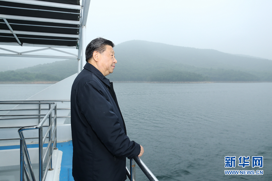 5月14日上午,中共中央总书记、国家主席、中央军委主席习近平在河南省南阳市主持召开推进南水北调后续工程高质量发展座谈会并发表重要讲话。这是座谈会前,习近平于13日在南阳市淅川县乘船考察丹江口水库。新华社记者 鞠鹏 摄